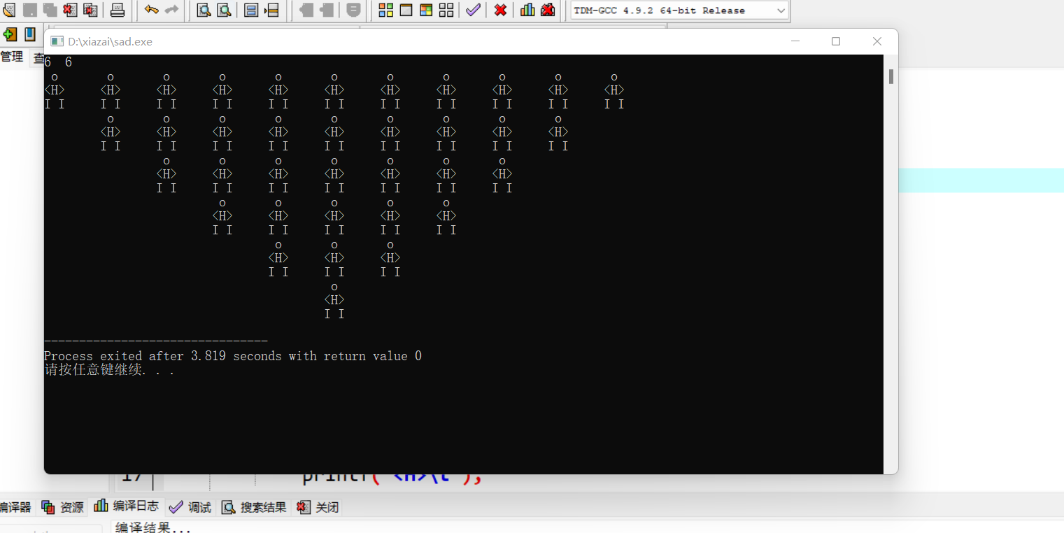 #include<stdio.h> int main() { int i, j, n, s, k,q,r,t,p; scanf_s("%d", &n); s = n; for (i = 1; i <= n; i++) { for (j = 1; j < i; j++) printf("\t"); for (k = 1; k <= (2 * s - 1); k++) printf(" o \t"); printf("\n"); for (q = 1; q < i; q++) printf("\t"); for (r = 1; r <= (2 * s - 1); r++) printf("<H>\t"); printf("\n"); for (t = 1; t < i; t++) printf("\t"); for (p = 1; p <= (2 * s - 1); p++) printf("I I\t"); printf("\n"); s = s - 1; } return 0; }