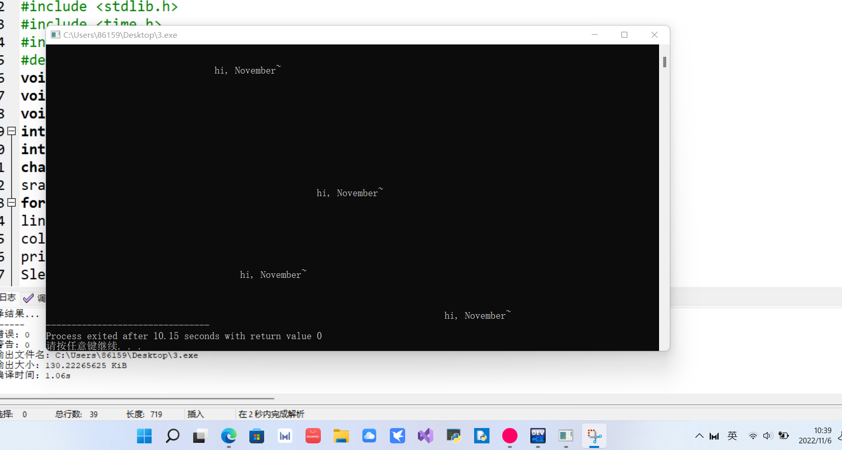 #include <stdio.h> #include <stdlib.h> #include <time.h> #include <windows.h> #define N 80 void print_text(int line, int col, char text[]); void print_spaces(int n); void print_blank_lines(int n); int main() { int line, col, i; char text[N] = "hi, November~"; srand(time(0)); for(i = 1; i <= 10; ++i) { line = rand() % 25; col = rand() % 80; print_text(line, col, text); Sleep(1000); } return 0; } void print_spaces(int n) { int i; for(i = 1; i <= n; ++i) printf(" "); } void print_blank_lines(int n) { int i; for(i = 1; i <= n; ++i) printf("\n"); } void print_text(int line, int col, char text[]) { print_blank_lines(line-1); print_spaces(col-1); printf("%s", text); }
