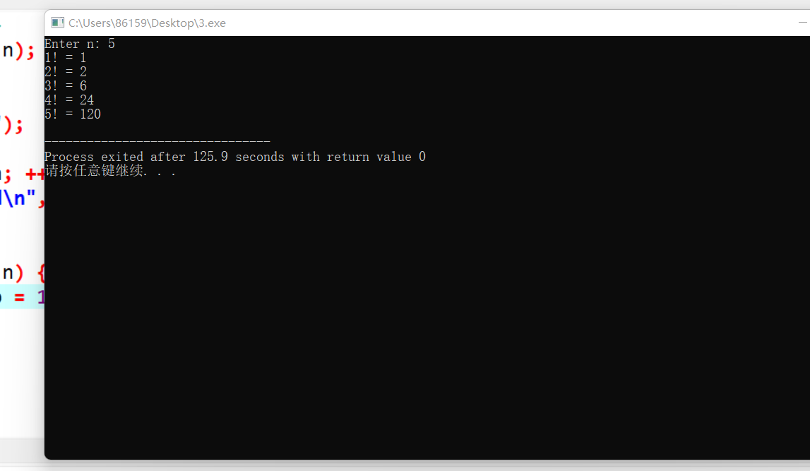 #include <stdio.h> long long fac(int n); int main() { int i, n; printf("Enter n: "); scanf("%d", &n); for (i = 1; i <= n; ++i) printf("%d! = %lld\n", i, fac(i)); return 0; } long long fac(int n) { static long long p = 1; p = p * n; return p; }