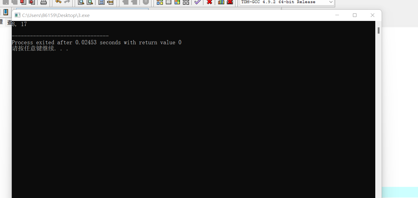 #include <stdio.h> int func(int, int); int main() { int k = 4, m = 1, p1, p2; p1 = func(k, m); p2 = func(k, m); printf("%d, %d\n", p1, p2); return 0; } int func(int a, int b) { static int m = 0, i = 2; i += m + 1; m = i + a + b; return m;