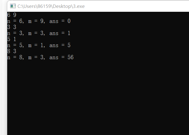 #include <stdio.h> int func(int n, int m); int main() { int n, m; while(scanf("%d%d", &n, &m) != EOF) printf("n = %d, m = %d, ans = %d\n", n, m, func(n, m)); return 0; } int func(int n, int m) { if(n==m || m==0) return 1; if(n<m) return 0; return func(n-1,m)+func(n-1,m-1); }