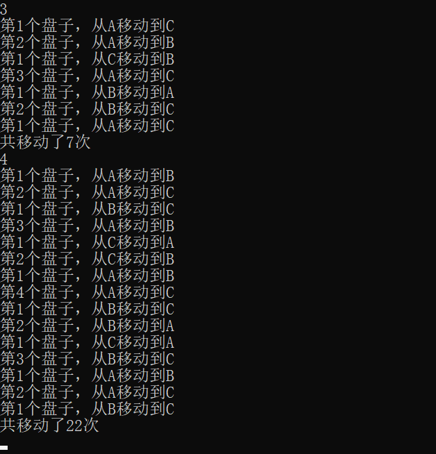 #include<stdio.h> #include<stdlib.h> void hanoi(unsigned n,char from,char temp,char to); void moveplate(unsigned n,char from,char to); long count=0; int main() { unsigned n; while( scanf_s("%u",&n)!=EOF) { hanoi(n,'A','B','C'); printf("一共移动了%ld次\n",count);} system ("pause"); return 0; } void hanoi(unsigned n, char from,char temp,char to){ if (n==1) {moveplate(n,from,to);} else { hanoi(n-1,from, to,temp); moveplate(n,from,to); hanoi(n-1,temp,from,to);} } void moveplate(unsigned n,char from,char to) {printf("%u:%c-->%c\n",n,from,to); count++; }