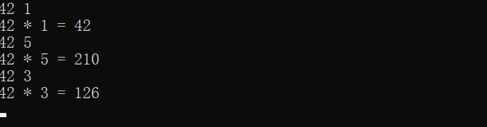 #include <stdio.h> int mul(int n, int m); int main() { int n, m; while(scanf("%d%d", &n, &m) != EOF) printf("%d * %d = %d\n", n, m, mul(n, m)); return 0; } int mul(int n, int m) { if(m==0||n==0) m = 0; M = m+mul(n-1,m);