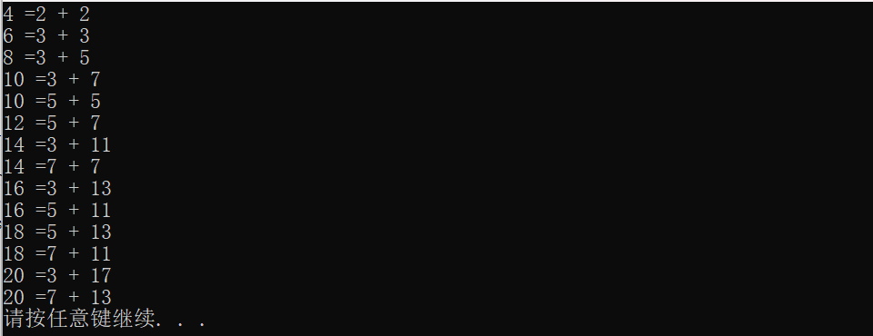 #include<stdio.h> int is_prime(int); int main() { int sum,a,b; for (sum=2;sum<=20;sum=sum+2) { for(a=1;a<=17;a++) { if(is_prime(a)) { for(b=1;b<=17;b++) { if(is_prime(b)&&a<= if(sum==a+b) printf("%d =%d + %d",sum,a,b); printf("\n"); } system("pause"); } int is_prime(int n) { int i; if (n <= 1) return 0; for (i = 2; i < n; i++) if (n % i == 0) return 0; return 1; }