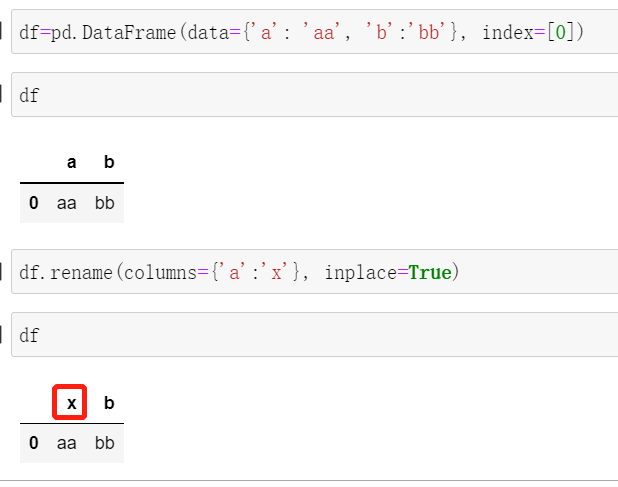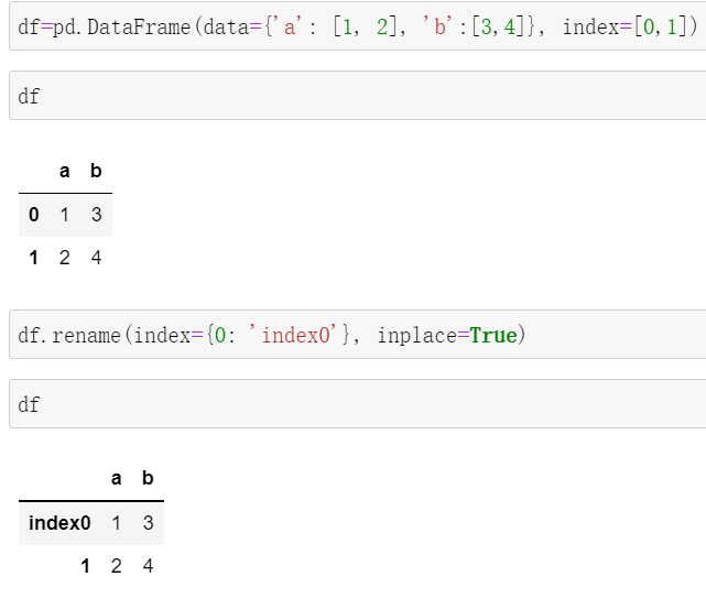 rename( mapper: Renamer | None = None, *, index: Renamer | None = None, columns: Renamer | None = None, axis: Axis | None = None, copy: bool = True, inplace: bool = False, level: Level | None = None, errors: str = "ignore" ): """ mapper: dict-like or function index: dict-like or function 指定要修改的行索引 columns: dict-like or function 指定要修改的列名 """