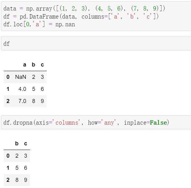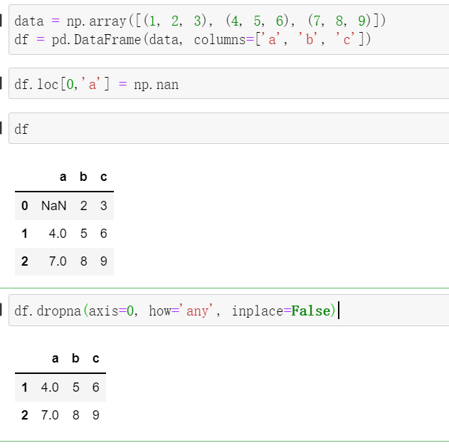 def dropna( axis: Axis = 0, how: str = "any", thresh=None, subset: IndexLabel = None, inplace: bool = False, ): """ axis : {0 or 'index', 1 or 'columns'}, default 0 要处理的轴,默认为0 0或者'index':删除包含NaN的行 1或者'columns':删除包含NaN的列 how : {'any', 'all'}, default 'any' 按哪种逻辑删除 any:只要包含NaN就删除该行或者列 all:只有全部都是NaN才删除该行或者列 thresh : int, optional Require that many non-NA values. subset : column label or sequence of labels, optional inplace : bool, default False """