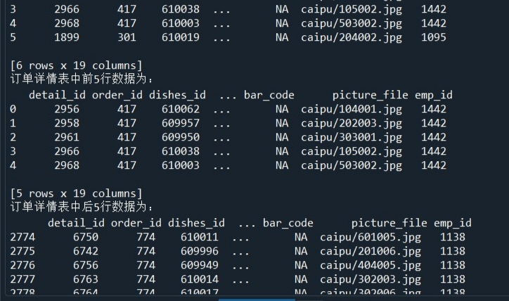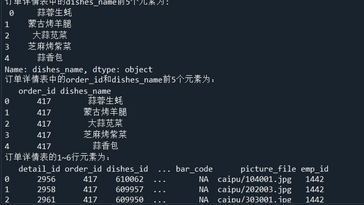 print('订单详情表中的order_id和dishes_name前5个元素为;','\n',orderDish)