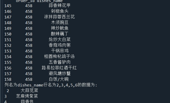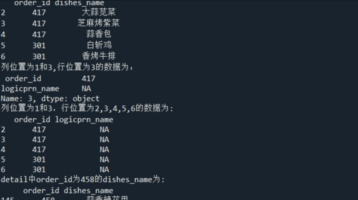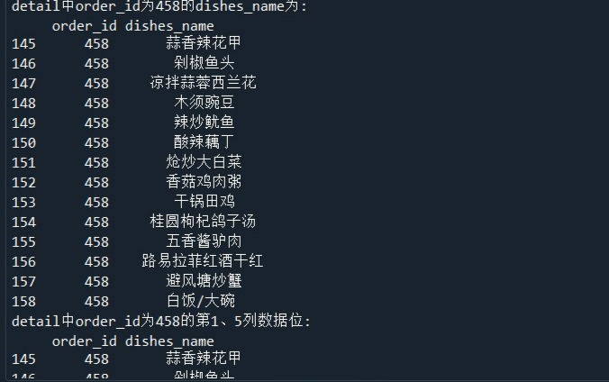 print('detail中order_id为458的dishes_name为:\n',detail.loc[detail['order_id']=='458',['order_id','dishes_name']])