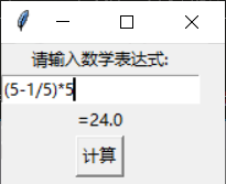 #coding=gbk import tkinter as tk """【""" def fun(): Result["text"]="="+str(eval(Exp.get())) root=tk.Tk() label01=tk.Label(root,text="请输入数学表达式:") label01.grid(row=0,column=0) tkStrVar=tk.StringVar() Exp=tk.Entry(root,textvariable=tkStrVar) Exp.grid(row=1,column=0) Result=tk.Label(root,text="=0") Result.grid(row=2,column=0) Btn=tk.Button(root,text="计算",command=lambda:fun()) Btn.grid(row=3,column=0) """】""" root.mainloop()