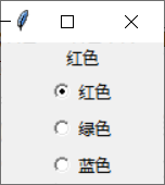 #coding=gbk import tkinter as tk """【""" def fun(): lab["text"]=var.get() root=tk.Tk() var=tk.StringVar() var.set("红色") lab=tk.Label(root,text="黑色") r1=tk.Radiobutton(root,text="红色",variable=var,value="红色",command=lambda:fun()) r2=tk.Radiobutton(root,text="绿色",variable=var,value="绿色",command=lambda:fun()) r3=tk.Radiobutton(root,text="蓝色",variable=var,value="蓝色",command=lambda:fun()) lab.pack() r1.pack() r2.pack() r3.pack()