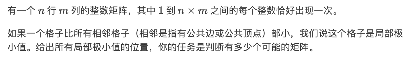 首先可以知道一个矩阵最多只能有8个特殊点,因此这8个点的状态很好表示,并且n,m数据范围很小,可以考虑用状压dp来计算