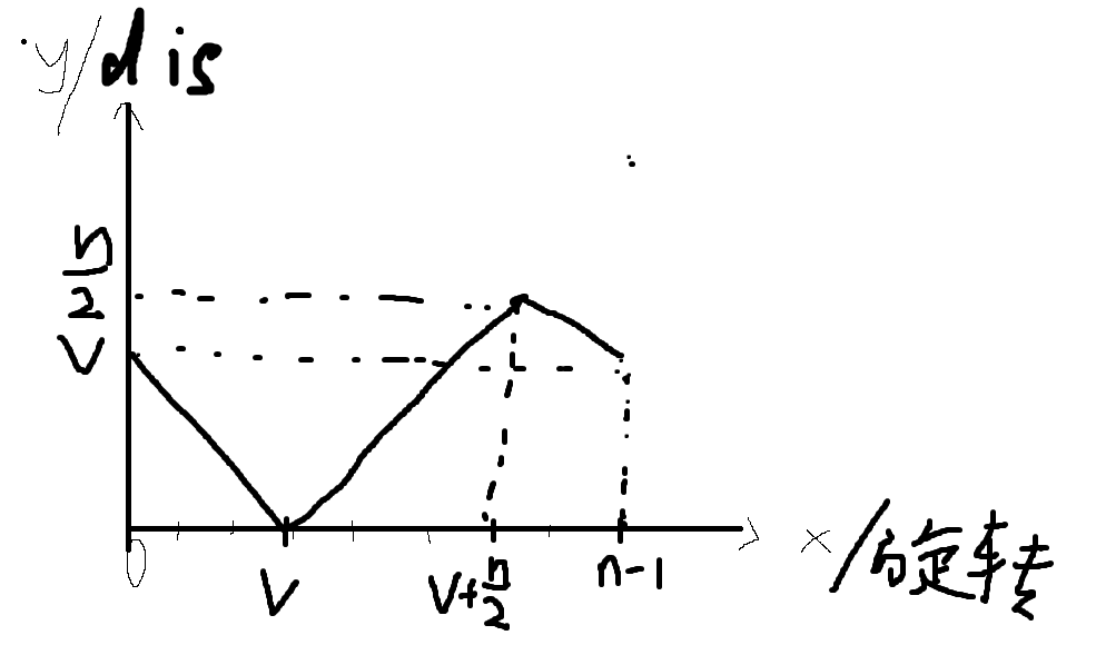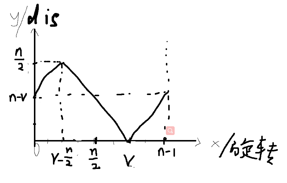 假设对于i,旋转v次,a[i]=i,那么对于i,距离和旋转次数的关系分两类