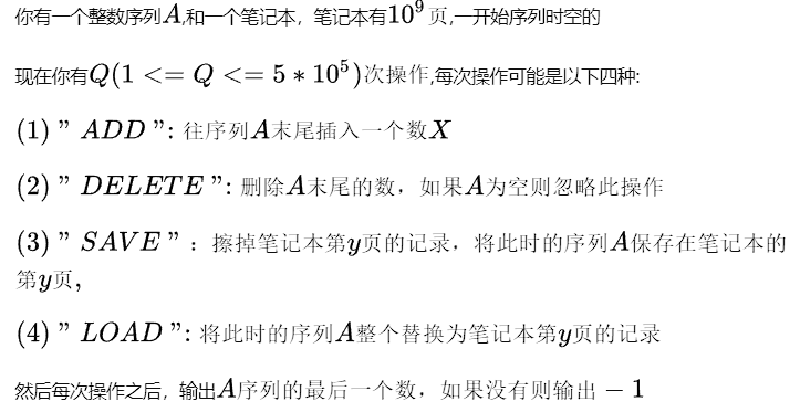 我们考虑一个很暴力的做法就是用很多个栈来维护,但这样我们每次save或者load操作的时候都需要将栈重新赋值,时间复杂度是\(O(n)\),那么Q次操作我们复杂度肯定是会TLE的,所以我们得换一种数据结构来维护。