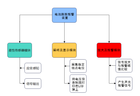 我们的产品是一种基于石墨烯柔性应变传感器的锂电池膨胀报警装置,目的为了解决生活中因不合理使用锂电池而导致的电池膨胀并引发设备瘫痪和安全事故的情况, 他们需要一款能够实时监测电池膨胀状态的报警装置, 但是现有的方案并没有很好地解决这些需求,我们有独特的办法,设计采用了石墨烯材料制成的柔性应变传感器,该传感器利用了石墨烯材料的电阻应变效应进行相应物理量的测量。当外力作用与该柔性传感器时,柔性材料会因形变而导致材料本身电阻率的变化,进而导致输出电路中相应桥臂电阻值的变化,最终影响到电桥输出电压值的变化。并将该值与报警阈值比较,若符合报警条件,则会输出蜂鸣器作为声音报警同时点亮红色 LED 作为光报警。它能给用户带来好处是在生产和生活上有助于防止安全事故和设备的损坏的发生,达到了人机关系的安全性目标。远远超过传统的采用测得电源输出的电流或电压大小等方式来间接计算电池的健康状况的方式。