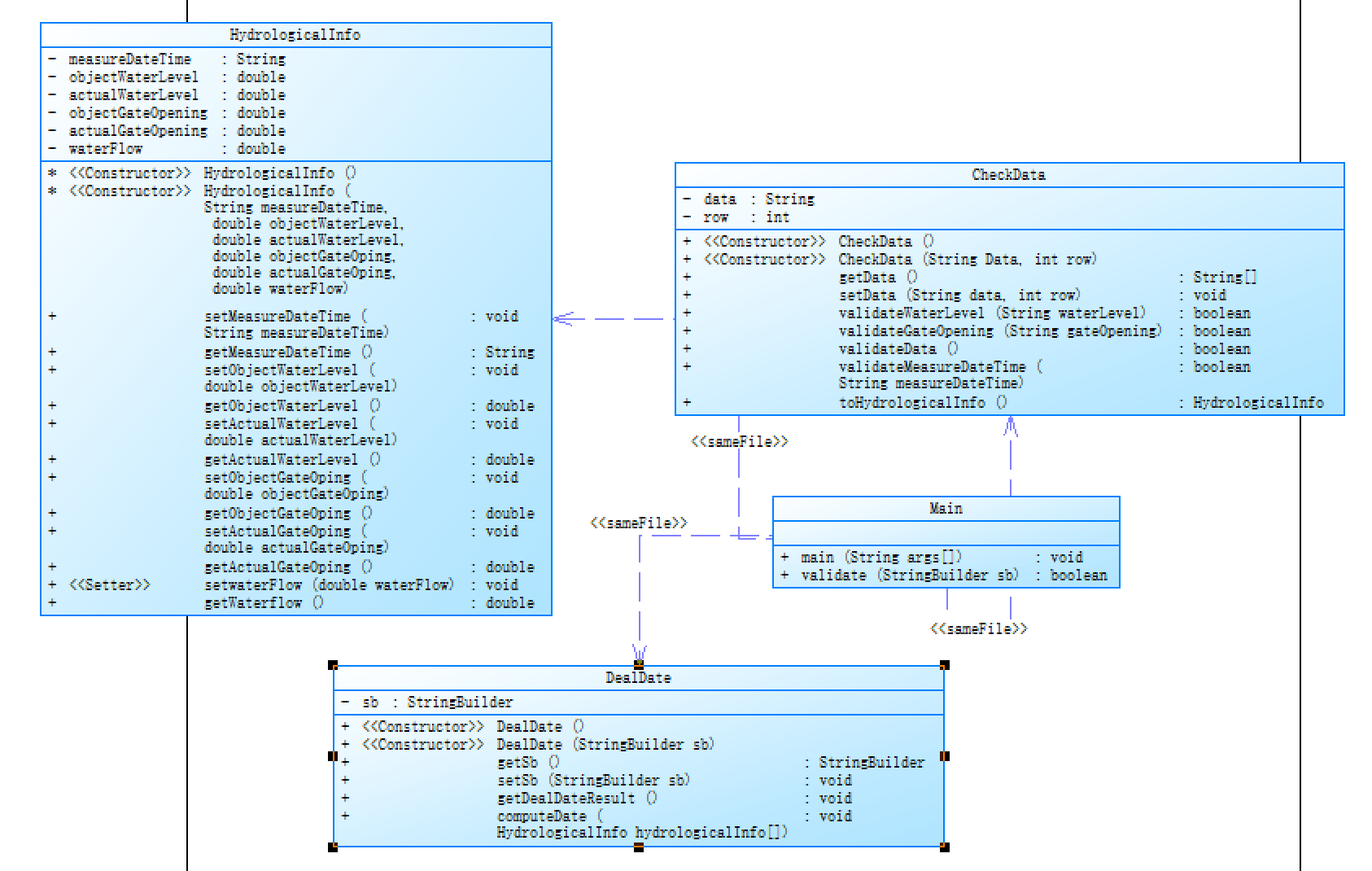 此题目使用了三个类(checkDate,DealDate,HydrologicalInfo)来解决问题,checkDate即检验字符串是否合法,DealDate计算合法的数据,HydrologicalInfo用来