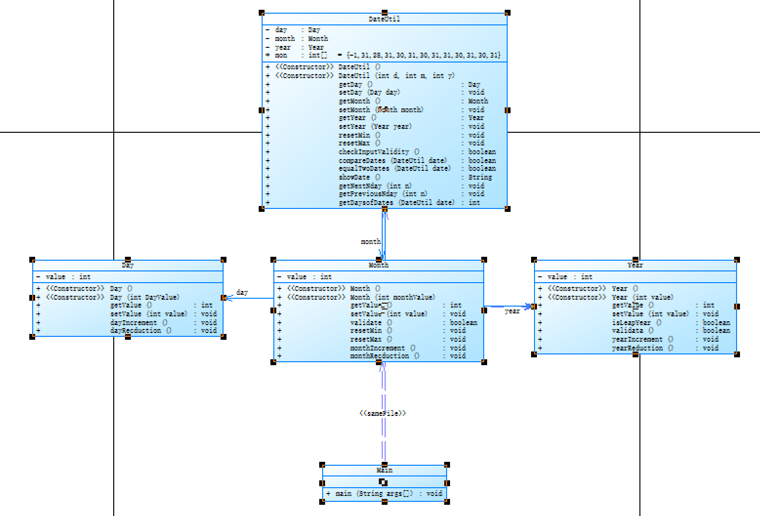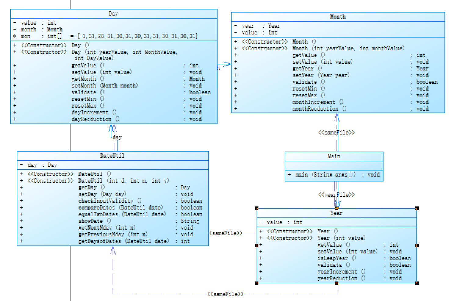 题目二代码分析:DateUtil直接与三个类(Day,Year,Month)聚合,注意构造关系和类中方法位置的改变即可.