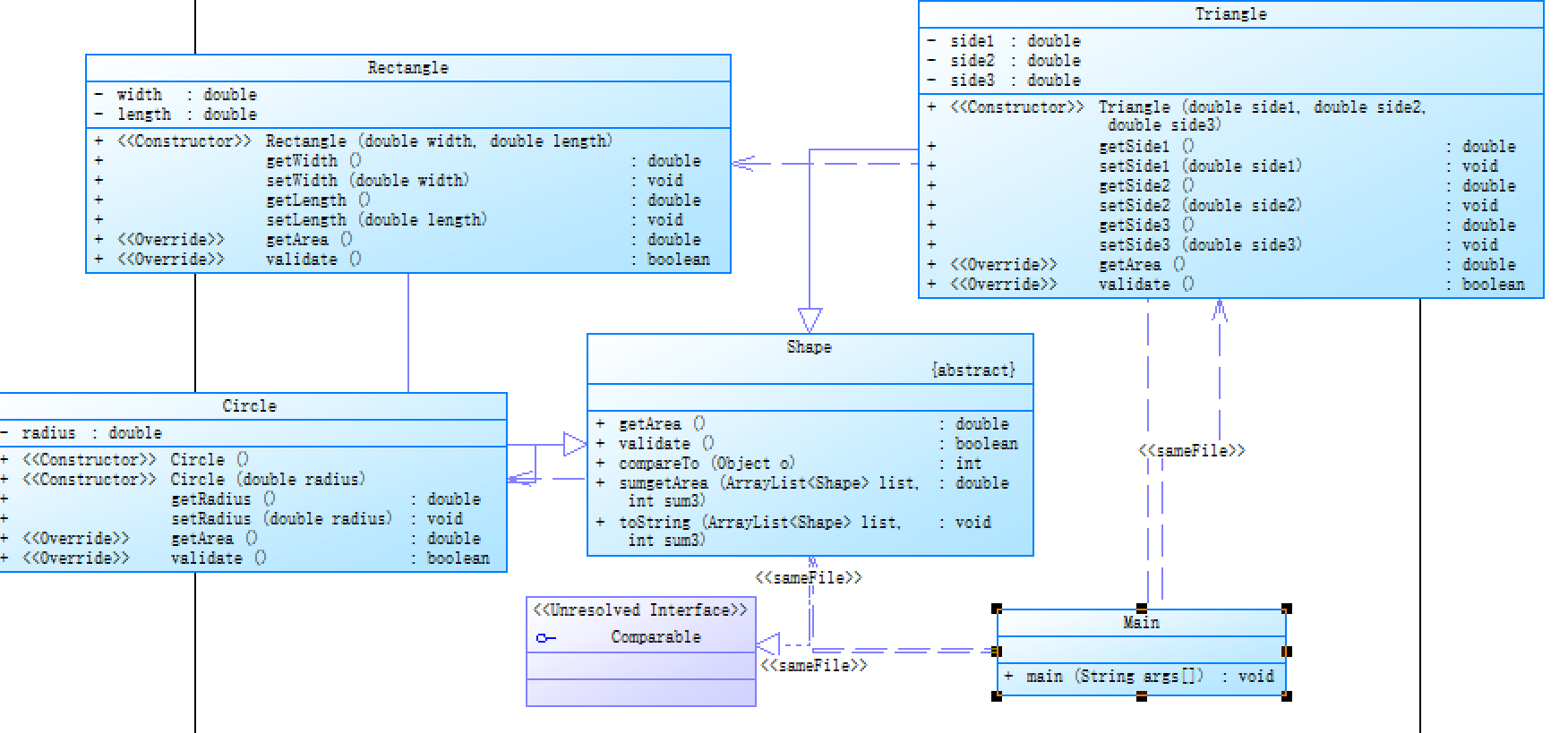 Circle,Recetangle,Triangle,三个类继承了Shape类,并在解题过程中使用了多态解决问题.在排序方
