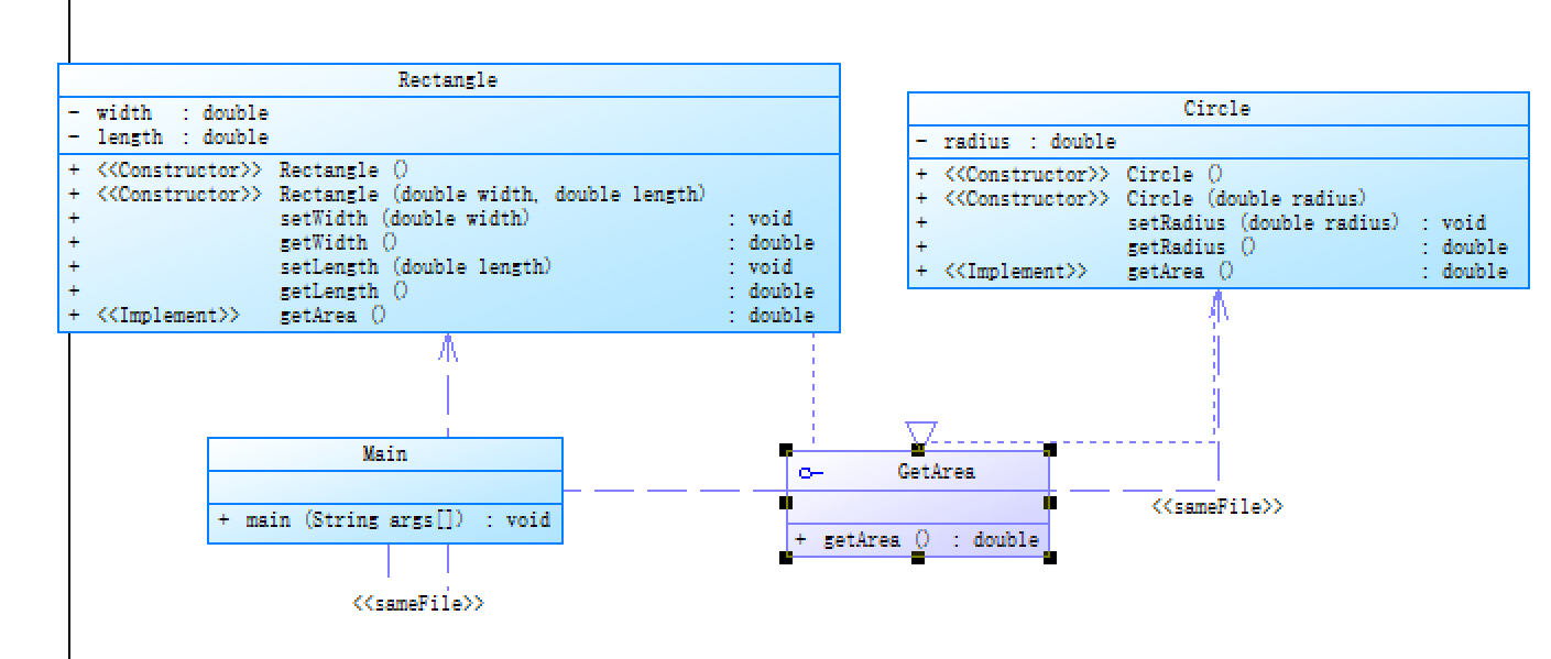 思路分析:构建一个接口,里面放置抽象getArea()方法,再由接入接口的两个类实现接口中的方法即可