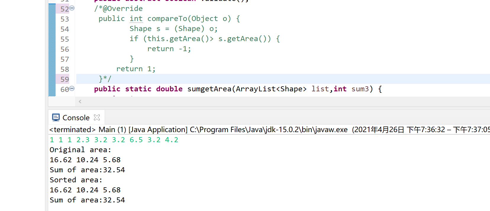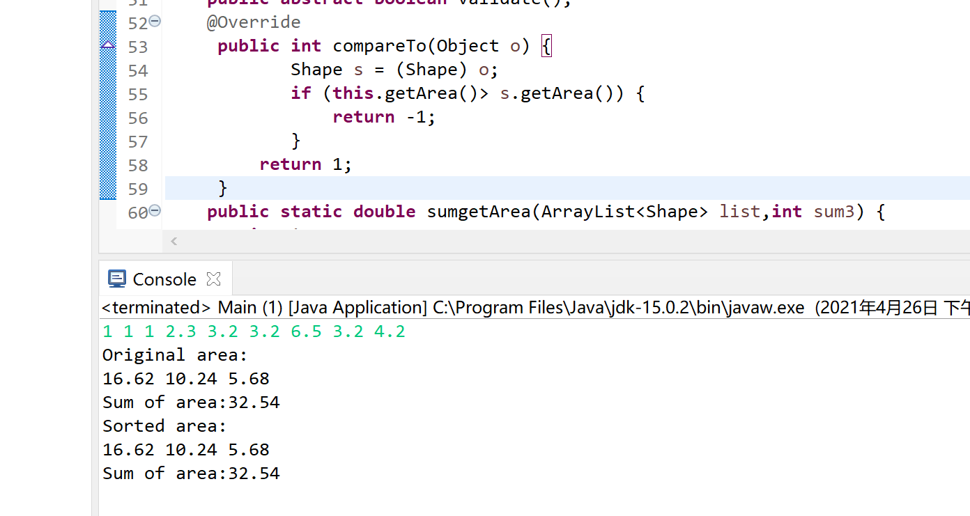 面重写了Comparable接口中的compareTo方法,按照Shape中的Area的值排序.