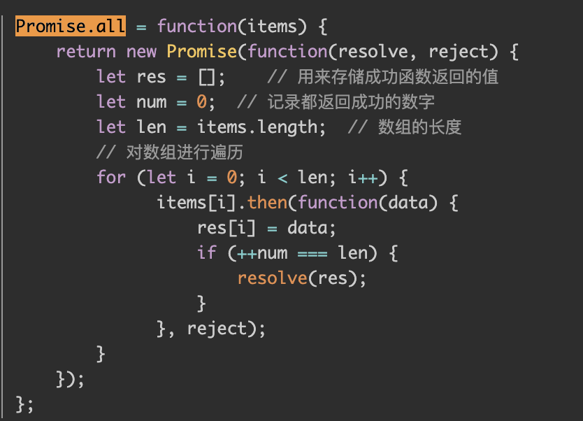 向下执行all方法,all方法实现是遍历[p,p,p,p] 数组执行p对象的then方法,并记录num,如果num等于数组长度的话,把结果数组resolve出来