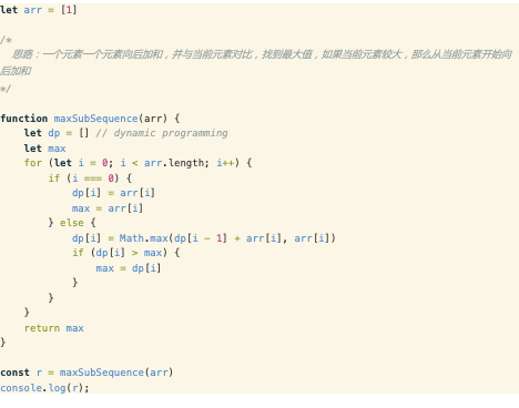 思路:一个元素一个元素向后加和,并与当前元素对比,找到最大值,如果当前元素较大,那么从当前元素开始向后加和