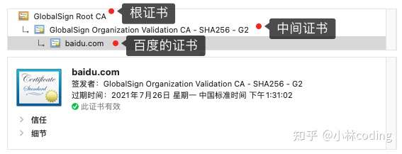 - “GlobalSign Organization Validation CA - SHA256 - G2” 证书被信任后,可以使用 “GlobalSign Organization Validation CA - SHA256 - G2” 证书中的公钥去验证 http://baidu.com 证书的可信性,如果验证通过,就可以信任 http://baidu.com 证书。