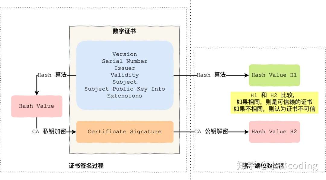 - 最后比较 H1 和 H2,如果值相同,则为可信赖的证书,否则则认为证书不可信。