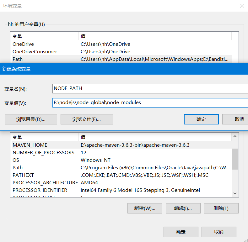 然后设置环境变量,在系统环境变量下新建NODE_PATH变量,值为E:\nodejs\node_global\node_modules。