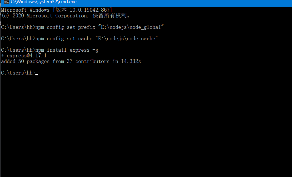 在nodejs安装根目录下,新建两个目录:node_global,node_cache,然后在windows输入以下命令