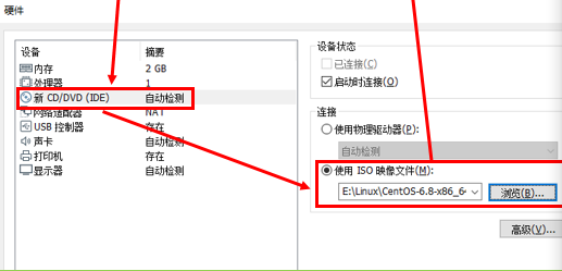 17、在弹出的硬件界面中选择“新CD/DVD(IDE)”,右边选择使用ISO镜像文件,选中CentOS6.8安装包,最后选择关闭
