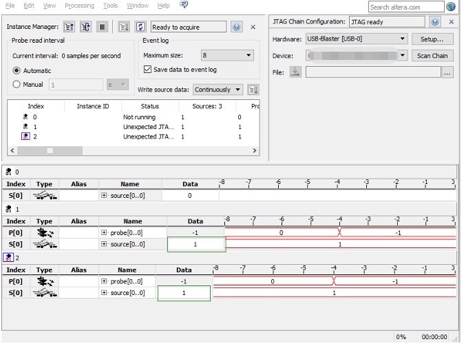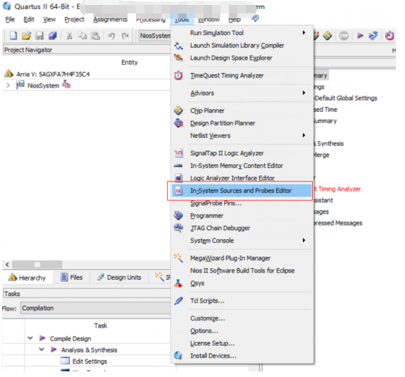 5)逻辑版本生成后,选择tools-> In-System Source and Probes Editor