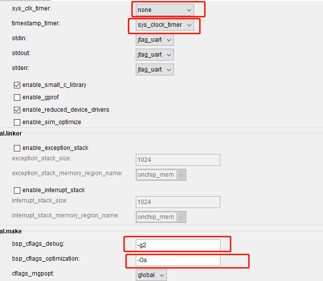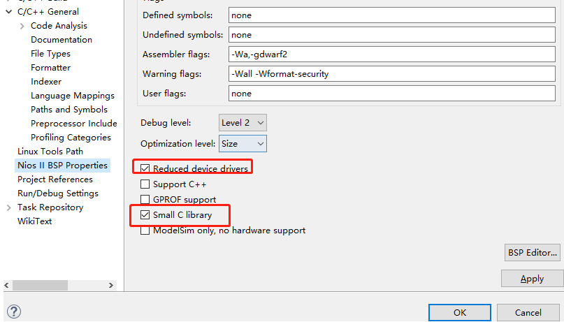 1、右键选择BSP工程-选择popertise-选择NIOS II BSP popertise,取消support C++,勾选Reduced device dirvers和small C library,还可以选择优化等级(一般Level 2)。