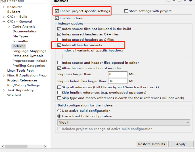 使用nios平台的eclipse时报错遇到的内存不足,头文件不识别等问题