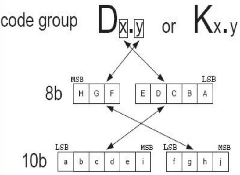 通常人们会将编码前低位的5bit EDCBA按其十进字数值计为X,高位的3bit HGF按其十进制数值为计Y,把这8bit数据计为D.x.y。在进行传输时我们除了传输数据本身,我们还需要嵌入一些控制信号,控制信号则依上面的规则计为K.x.y(称之为“comma”)。这里会有一个疑问,D.x.y中的x最多到D.31.y,y最多到D.x.7,xy都被数据占完了,还用什么表示控制码的K.x,y,下面一一道来。