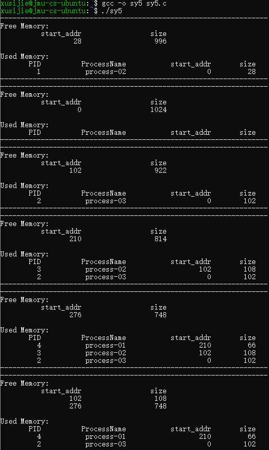 int main(int argc, char const *argv[]){ int p1,p2; int total=0; //统计分配内存的次数 free_block = init_free_block(mem_size); //初始化空闲区域 Prc prc[PROCESS_NUM]; init_program(prc,PROCESS_NUM);//初始化进程 srand( (unsigned)time( NULL ) ); for(int i=0;i<DATA_NUM;++i){ p1=rand()%2; int count=0; for(int j=0;j<PROCESS_NUM;++j){ if(prc[j].pid!=-1) count++; } if((count==PROCESS_NUM && p1==0)||total==10){ p1=1; } if(count==0 && p1==1){ p1=0; } if(p1==0){ do{ p2=rand()%PROCESS_NUM; }while(prc[p2].pid!=-1); alloc_process(prc[p2]); prc[p2].pid=pid; total++; display_mem_usage();//输出内存使用情况 } else { do{ p2=rand()%PROCESS_NUM; }while(prc[p2].pid==-1); kill_process(prc[p2].pid); prc[p2].pid=-1; display_mem_usage(); } } }