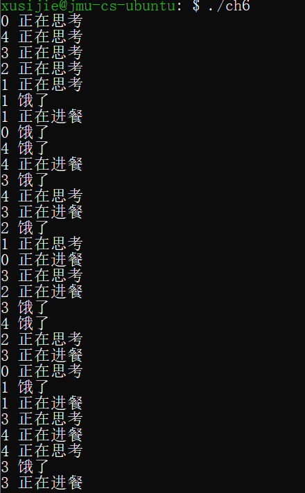 - 结果分析:一共有0-4五位哲学家,一开始五位哲学家都在思考,一段时间后哲学家饿了,若是两边筷子都可以使用,才能够进餐,只要有一边的筷子正在被使用则该哲学家需要等待无法就餐,即相邻的两位哲学家不能同时用餐。