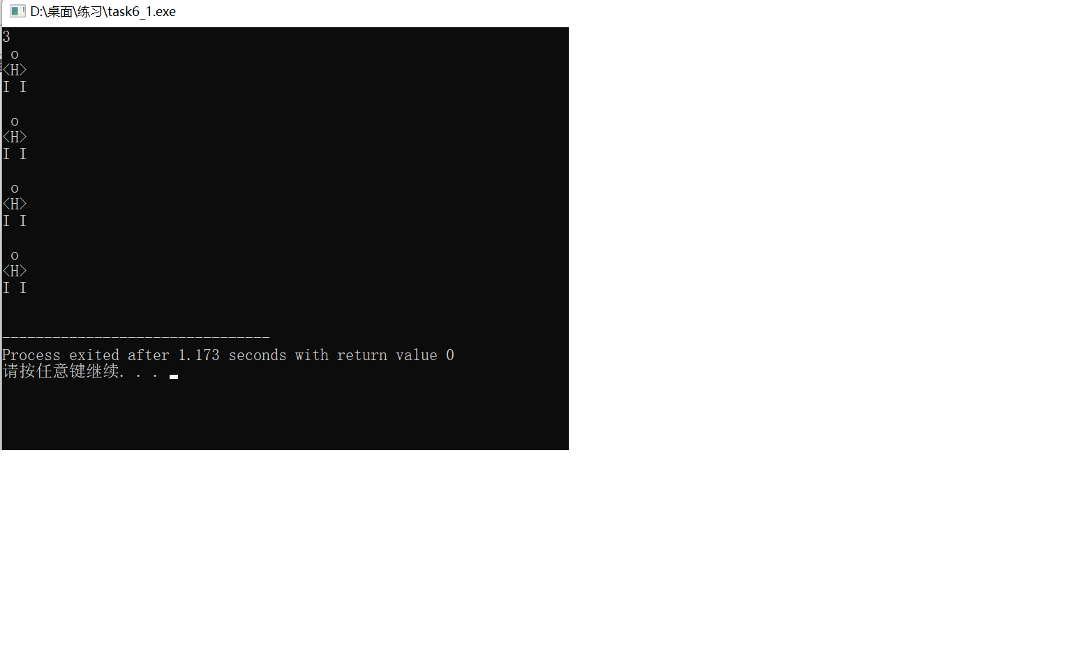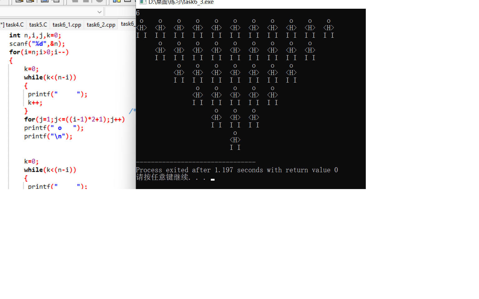 1 #include<stdio.h> 2 #include<math.h> 3 int main() 4 { 5 int n,i,j,k=0; 6 scanf("%d",&n); 7 for(i=1;i<=n;i++) /*这里的i表示当把一排完整小人看成一个整体后,执行自己这样的命令,输出几次*/ 8 { 9 k=0; 10 while(k<(i-1)) /*第一行输出时不执行空格语句,所以选用while{}而不用do{}while;不然即使条件不满足也会先执行一次*/ 11 { 12 printf(" "); 13 k++; 14 } 15 for(j=1;j<=((abs(i-n-1)-1)*2+1);j++) 16 printf(" o "); 17 printf("\n"); /*当某个部位全部输出完成,需要换行,且不能直接加在”o \n",这样每个循环都会执行一次换行*/ 18 19 k=0; /*与实验四的分母的计算一样,要及时赋值0再进行循环,注意赋值0语句的位置!*/ 20 while(k<(i-1)) /*注意每个身体部位输出前都要有相同的空格,所以相同的语句会出现在每个部位执行之前*/ 21 { 22 printf(" "); 23 k++; 24 } 25 for(j=1;j<=((abs(i-n-1)-1)*2+1);j++) 26 printf("<H> "); 27 printf("\n"); 28 29 k=0; 30 while(k<(i-1)) 31 { 32 printf(" "); 33 k++; 34 } 35 for(j=1;j<=((abs(i-n-1)-1)*2+1);j++) 36 printf("I I "); 37 printf("\n"); 38 } 39 40 }