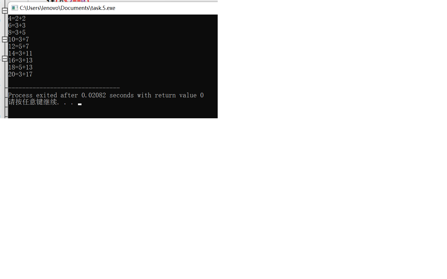 1 #include<stdio.h> 2 int is_prime(int); 3 int main() 4 { 5 int n; 6 for(n=2;n<=20;n++) 7 { 8 if(n%2==0) 9 { 10 int i; 11 for(i=1;i<=n;i++) 12 { 13 if(is_prime(i)&&is_prime(n-i)) 14 { 15 printf("%d=%d+%d\n",n,i,n-i); 16 break; 17 } 18 } 19 } 20 } 21 } 22 23 is_prime(int n) 24 { 25 int i; 26 for(i=2;i<=n;i++) 27 { 28 if(n%i==0) 29 break; 30 } 31 if(i==e444n) 32 return 1; 33 else 34 return 0; 35 }