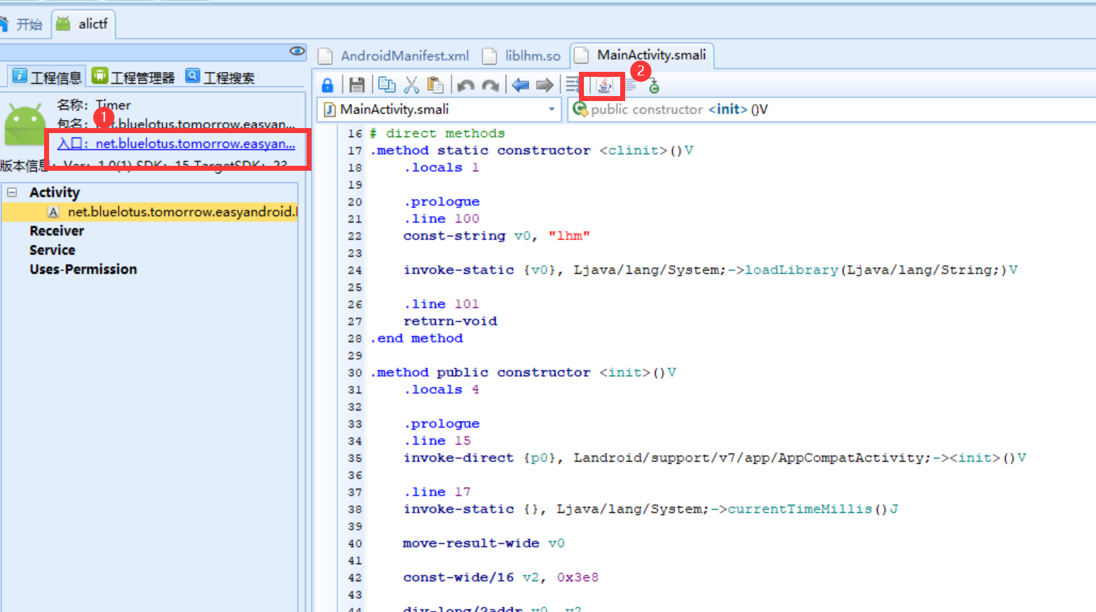 先点入口找到入口的smali,然后点一下java小茶杯就能看到源码了,比较清晰一些,不过看smali是逆向必须要求的,所以也要加强一下下。