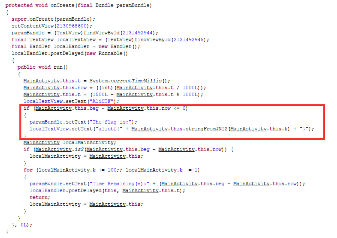 这就是判断程序执行结束的标志和显示的flag,也就是beg-now<=0,flag的值就是最后的k值传到stringFromJNI2的结果。