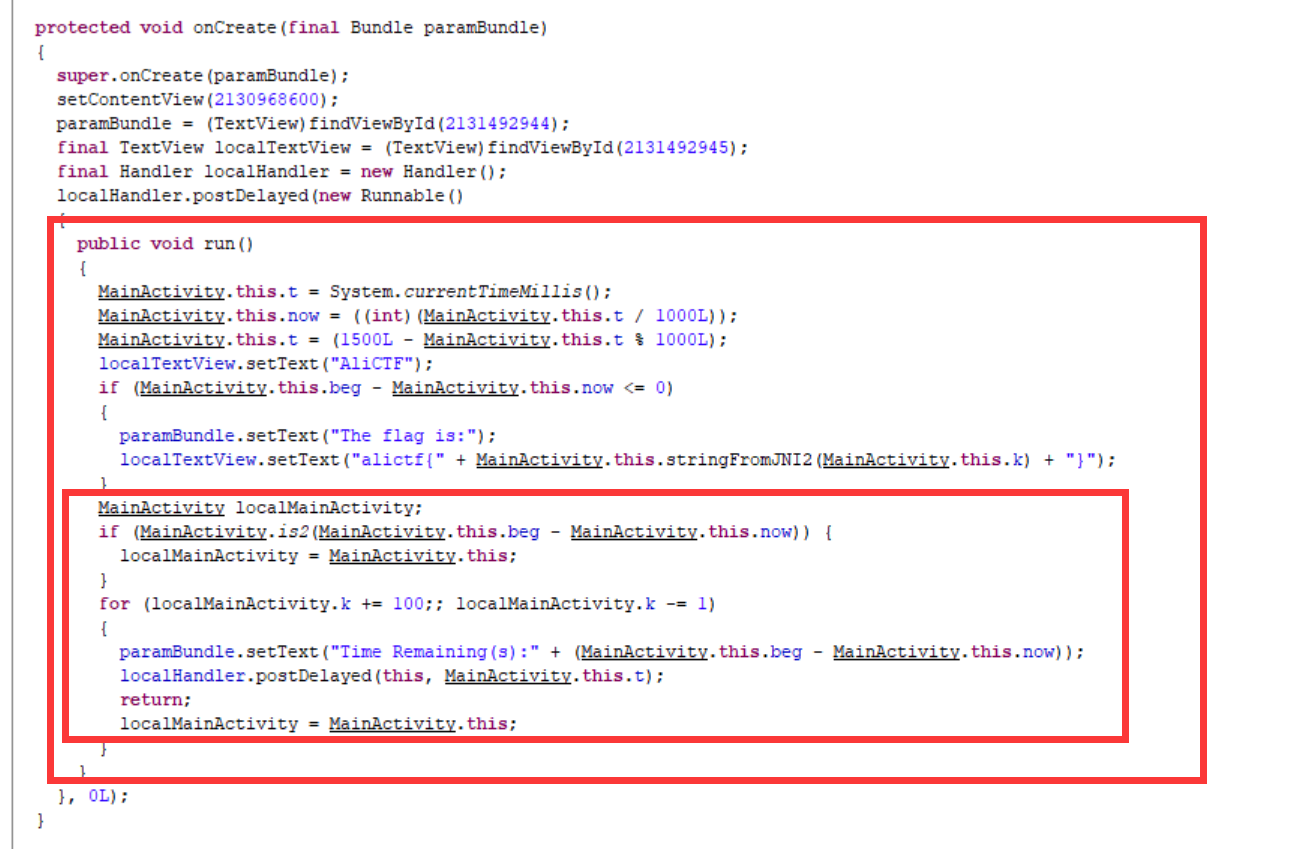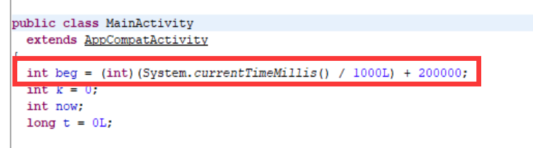 然后可以看到就是一个localMainActivity的对象,算了这里实在不明白谁是谁,Java真的太难懂了,然后就是可以理解用is2函数判断beg-now的值如果返回1的话,就执行括号里面的的localMainActivity = MainActivity.this;