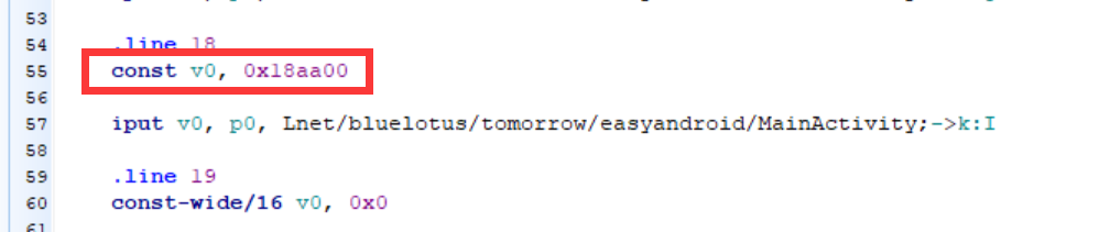 const/4 是指把4位常量赋值给寄存器V0,我们修改V0的值时一定要把const/4改为 const,因为18aa00(1616384)的位数是大于4位的,不修改会编译失败。