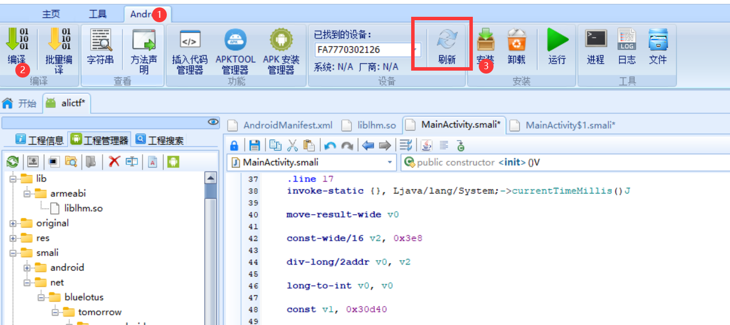 然后先ctrl s保存修改,切到Android页面,依次点击,要是已找到设备那里木有的话刷新一下,这个一键安装功能真好用呀~~