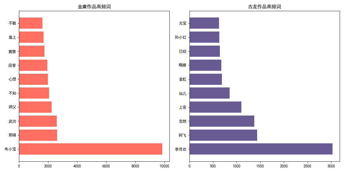 - 拓展:金庸、古龙等武侠小说写作风格分析。输出不少于3个金庸(古龙)作品的最常用10 个词语,找到其中的相关性,总结其风格。