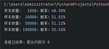 print(f"样本数量:{size:6},概率:{prob:.2%}")