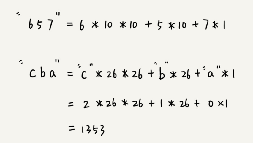 “657”看作十进制表示,“cba"看作26禁止表示,即只算小写字母有26个字符。