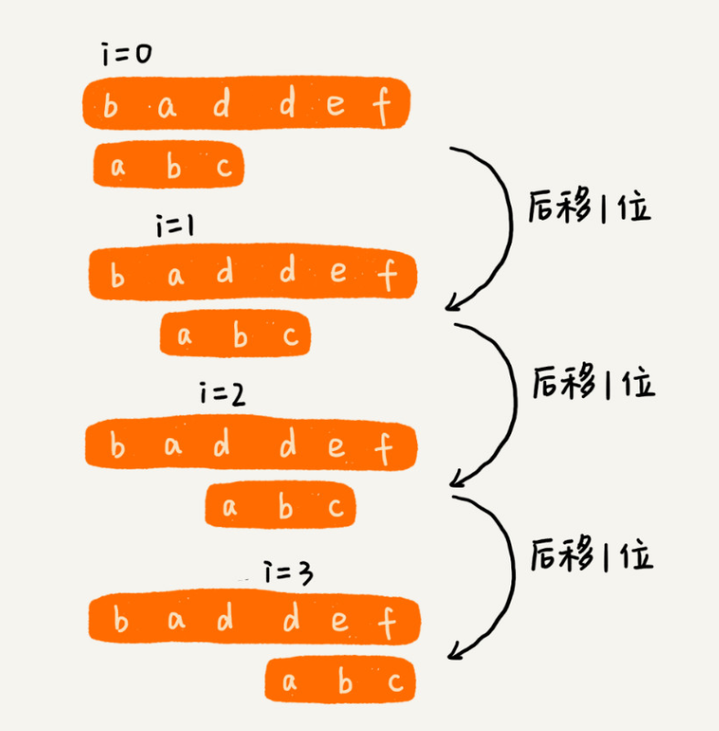 BF算法得思想是:我们在主串中,检查起始位置分别为0,1,2... n-m,且长度为m得n-m+1个子串,看有没有跟模式串匹配的。