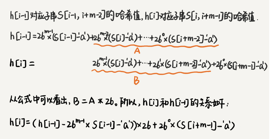 下面以字符串中只包含a-z这26个小写字符为例,在哈希值的计算中有一个特点,相邻两个子串s[i-1]和s[i] (i表示子串在主串中的起始位置,子串长度均为m),对应的哈希值计算公式有交集。由公式表示如下图: