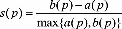 其中a(p)是点p与同一簇中的其他点p’之间的平均距离; b(p)是点p与另一个不同簇中的点之间的最小平均距离(如果有n个其他簇, 则只计算和点p最接近的一簇中的点与该点的平均距离) 。 a(p)反映的是p所属簇中数据的紧凑程度, b(p)反映的是该簇与其他临近簇的分离程度。 显然, b(p)越大, a(p)越小, 对应的聚类质量越好, 因此我们将所有点对应的轮廓系数s(p)求平均值来度量聚类结果的质量。即s(p)越接近于1,聚类效果越好。 -