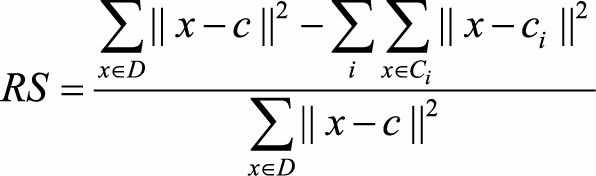 代表将数据集聚类之后的平方误差和, 所以RS代表了聚类之后的结果与聚类之前相比, 对应的平方误差和指标的改进幅度。该幅度越大越好。